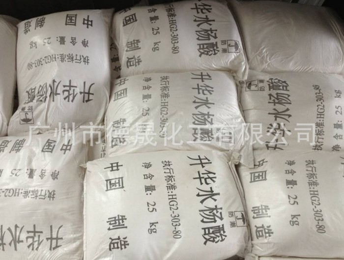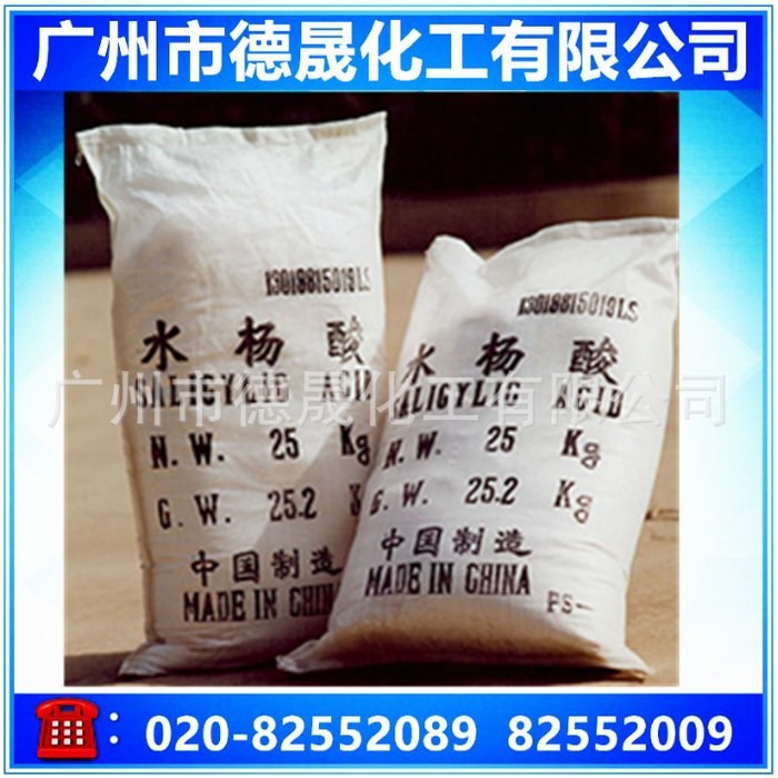 本品為白色塊狀和粉末,允許微黃或淡粉紅色,無臭味微甜后轉辛,置空氣中無變化,76℃以上能常壓升華。常壓加熱易脫羧而成苯酚及二氧化碳;其水溶液呈酸性反應,遇FeCl3呈紫色。本品在水中微溶、在沸水中溶解、在乙醇或乙醚中易溶,在氯仿中略溶。